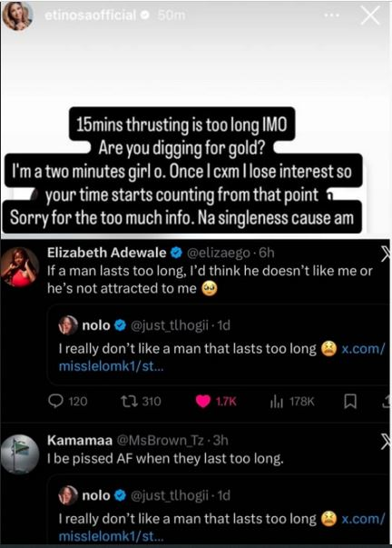 Etinosa responded to the 𝕏 conversation after a user complained about men “lasting too long.” She did not hold back, saying, “15min thrusting is too long IMO are you digging for gold? I’m a two-minute girl o. Once I cxm I lose interest so you time start counting from that point. Sorry for the too much info. Na singleness cause am.”